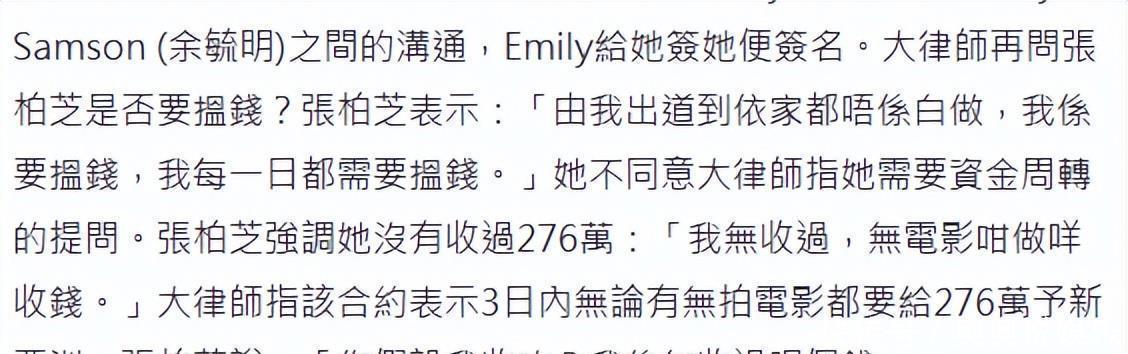张柏芝平直深远,我方从出谈当演员到当今,扫数付出皆不是空费的,每天皆得致力赢利,压根莫得缺钱用来盘活的情况。她还提到,她和余毓兴签的公约不相同,他拿出来的阿谁公约是假的,一直强调我方从来莫得收到过276万元。