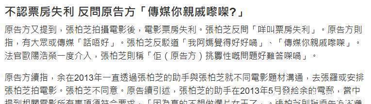有一场戏是在冰天雪地里拍的,但她以为太冷了,硬是不肯意上,恶果让整个演这场戏的老演员一直等着她。向太提到,张柏芝从不主动找她,只消在我方碰到贫窭、需要赞理的时候,才会带着眼泪向她乞助。